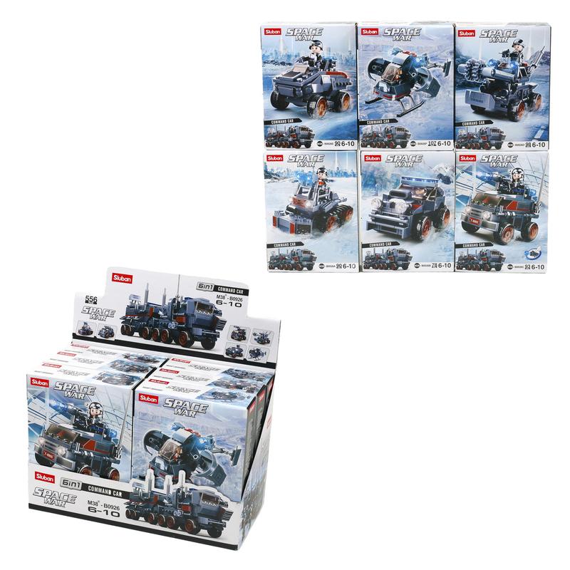 Конструктор SLUBAN Космічна війна. 6 видів, 78-107 деталей, фігурки людей та транспорт. Вік - 6-10 років. Матеріал - пластик. Паковання — дисплей, 6 шт. Розмір - 29х20х14 см.