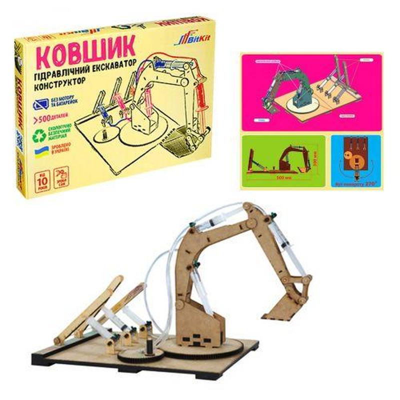 Конструктор гідравлічний "Ковшик". Особливості даного конструктора: без мотора і не требуетаккумуляторов; гідравлічний і зубчастий механізм; можливість управління ковшем (нахил, поворот, оборот); збирається швидко і не вимагає додаткових інструментів. Підіймає вага до 200 г. Для дітей від 10 років.