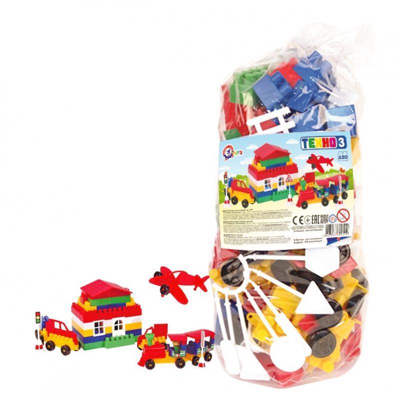 Конструктор "Техно 3", 130 деталей. Великі кольорові елементи з колесами, вікна, інші предмети. Матеріал - пластик. Упаковка - пакет. Розмір - 20х16х45 см.