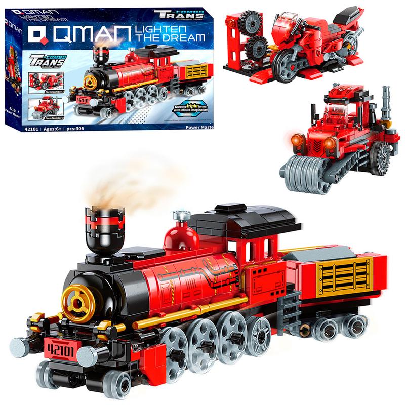 Конструктор Qman 3в1 - поїзд, будтехніка, мотоцикл. В наборі 305 деталей. В коробці. Виробництво - Китай. Артикул 42101.
