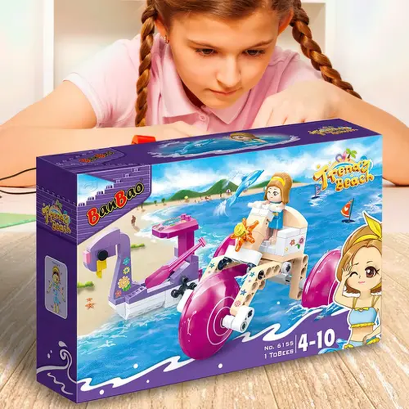 Конструктор "Модный пляж" Игры на воде ТМ Banbao 135 детали (6155) Конструктор "Модный пляж" Игры на водителе Banbao 135детали (6155) методы воспитания и образования будут меняться бесконечно, но во все времена постоянным остается одно — радость ребенка от подаренной ему игрушки. Как известно, счастливая улыбка малыша – наибольшая награда для родителей. Конструктор "Модный пляж", 135 элементов — отличный подарок вашему малышу. Этот набор включает в себя фигурку и хорошие декорации для игры с ней. В процессе такого увлекательного занятия дети становятся более усидчивыми и внимательными, а манипуляции с миниатюрными элементами конструктора благотворно влияют на улучшение мелкой моторики рук. Характеристики: Материал: пластик; Фигурки ToBees: 1 персонаж; Количество деталей: 135 блоков; Возраст: от 4 лет.