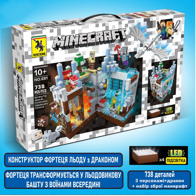 Конструктор Трансформер Майнкрафт "Крепость Льда с драконом" - 738 детали с 3 персонажами lego + комплект оружия Майнкрафт. Погрузитесь в мир творчества и приключений с уникальной разборной Крепостью Льда с Драконом и лед подсветкой, вдохновленной игрой Minecraft! Высокая детализация персонажей и декораций в стиле Майнкрафт создаст интересную атмосферу игры для вашего ребенка! В наборе: • 3 минифигурки персонажей и Синий Дракон + комплект оружия • дополнительные здания и декорации (фонари, сундук с сокровищем, башня лучника) • Лед подсветки крепости • Дракон движущегося льда. • Конструктор трансформер, Башня открывается в крепость Для детей 6-14 лет Особенности: • уникальный набор Ледниковый Куб Майкрофт, который разлагается в Крепость Льда • Максимальное сходство с персонажами и стилем игры Minecraft • Возможность перестройки в разные варианты и соединение с другими локациями • Прочный и безопасный ABS пластик • Развивает воображение, мелкую моторику и творческое мышление Почему следует выбрать: Этот набор подарит ребенку часы увлекательной игры и море положительных эмоций. Строительство, активные блоки, лед подсветки, движущиеся персонажи и большой Дракон Льда - превращает игру в настоящее приключение! Комплектация: • Конструктор (738 деталей) • Инструкция с пошаговой сборкой • Большая подарочная коробка • 3 минифигурки + дракон незера + набор оружия Майнкрафт