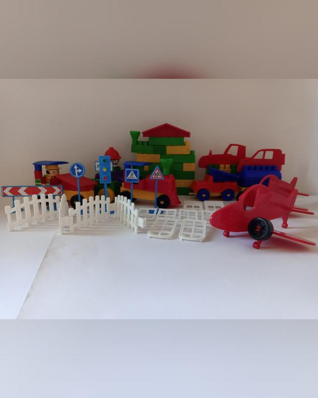 Конструктори-машинки, деталі до великого конструктора Технок, щоб виготовляти поїзди, машинки чи літачки. Є також парканчик, віконця, двері та дорожні знаки. Ціна за все разом, що на фото.