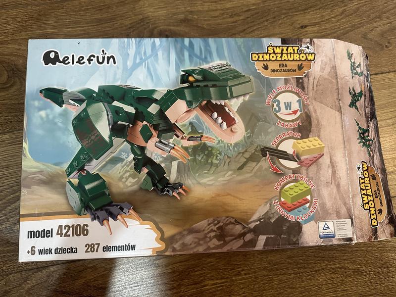 конструктор Elefun «Мир динозавров»модели 42106. • Количество элементов: 287. • Возраст: от 6 лет. • Особенности: набор позволяет собрать 3 разных фигуры (3-в-1) и включает сепаратор для разделения деталей. • Совместимость: детали совместимы с другими конструкторами Конструктор открыт, но дочке он не интересен и она его не собирала .