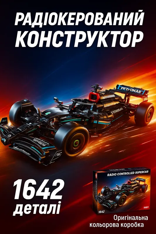 ЦІНА БЕЗ РАДІОКЕРУВАННЯ - 1890 ЦІНА З РАДІОКЕРУВАННЯМ - 2790 Конструктор Mercedes-AMG F1 W14 E Performance (артикул 42171) Технічний конструктор боліда Формули-1 Mercedes-AMG F1 W14 E Performance сезону 2023 року. Деталізована модель у масштабі 1:8 для поціновувачів автоспорту. Ключові деталі та функції: Модель: Гоночний болід Mercedes-AMG F1 W14 E Performance. Масштаб: 1:8. Кількість елементів: 1642 деталі (висока складність). Реалістична механіка: Модель має автентичні робочі функції: Функціональне рульове керування (з ручкою на даху). Реалістична підвіска передніх та задніх коліс. 6-циліндровий двигун з рухомими поршнями. Робочий диференціал. Регульоване заднє антикрило (імітація системи DRS). Рекомендований вік: 18+ (для досвідчених збирачів). Матеріал: Високоякісний та міцний ABS-пластик. Конструктор сумісний з оригінальними деталями LEGO.