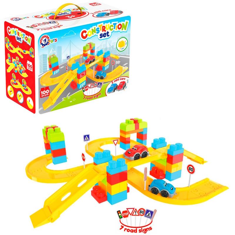 Конструктор для найменших із великими елементами. За допомогою якого малюк зможе побудувати різні автомагістралі з поворотами, підйомами та перехрещеннями. Використовувану уяву, дитина зможе побудувати будь-яку форму треку для гри машинками. До комплекту входять 2 машинки із серії Міні ТехноК. А також набір із 7 дорожніх знаків, за допомогою яких дитина почне знайомиться з правилами дорожнього руху. Кількість деталей: 100 Розмір коробки 37х28х20 см.