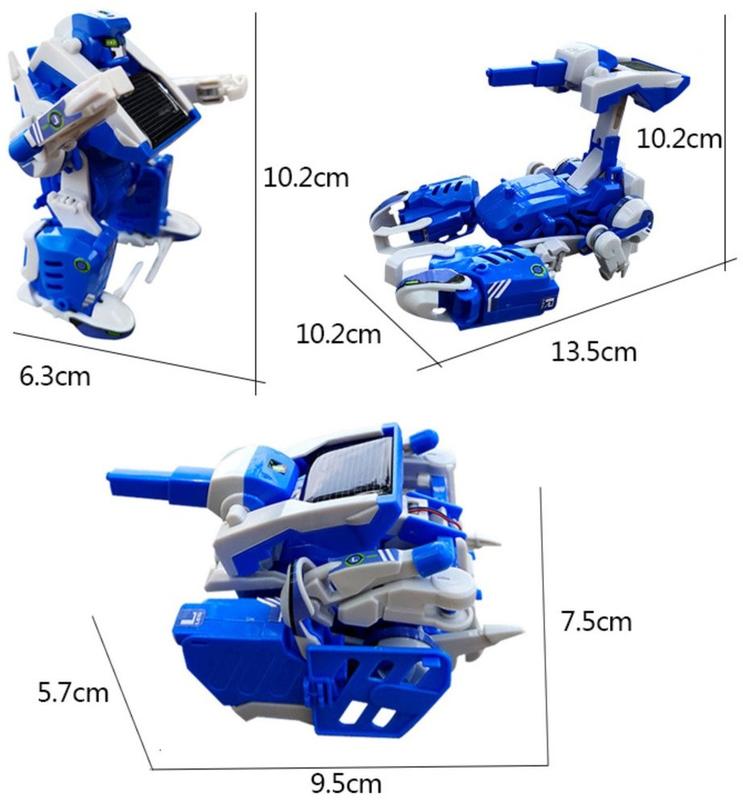Конструктор на солнечной батарее Solar Robot 3 в 1 новинка в нашем онлайн -- магазине. С деталей конструктора Вы можете собрать танк, скорпиона или стандартного робота. Но замечательной особенностью этой игрушки является наличие источника питания работающего на солнечной энергии, поэтому этот конструктор может быть использован в образовательных целях, для знакомства детей с солнечной энергетикой. Игрушка очень наглядно демонстрирует действие солнечного света, под лучами которого механические игрушки оживают и начинают перемещаться. Будучи роботом, танком или скорпионом, трансформер воспринимает только яркие прямые солнечные лучи. В помещении Вы сможете питать его с помощью галогенной лампы. Это удивительная вещь поможет скоротать Вам время, а также поможет развить воображение и кругозор Вашим детям, которые интересуются, как это работает. Изучайте науку и воспитывайте юных инженеров вместе с конструктором Solar Robot 3 в 1. В комплект входят 15 элементов, из которых нужно собрать механизм и подсоединить солнечную батарею. Размер коробки 26 * 5 * 19 см.
