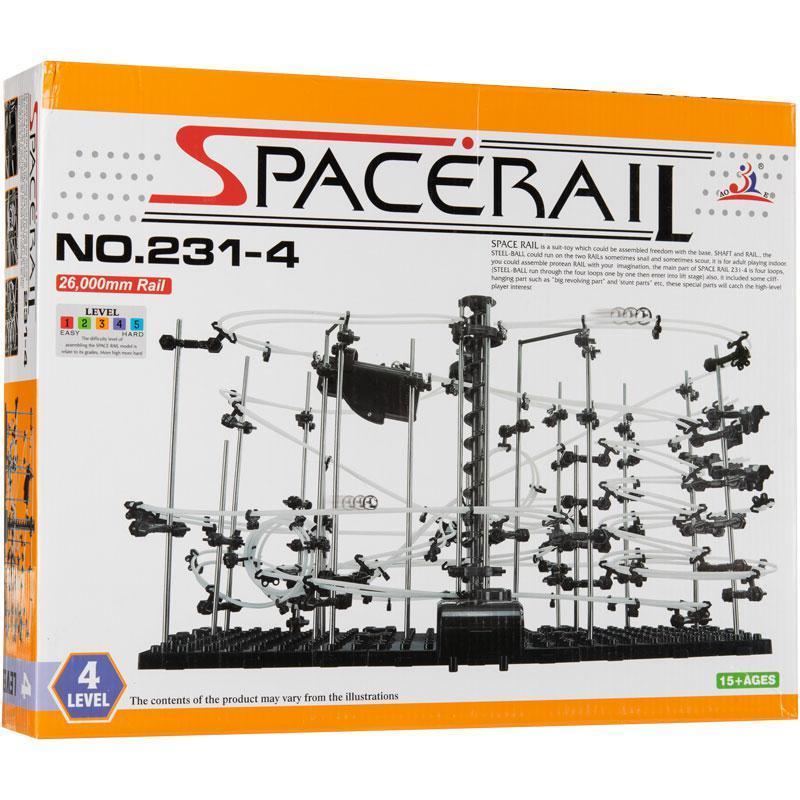 Четвертий, складніший рівень відомого конструктора SpaceRail. Траси стали довшими, складнішими, заплутанішими, а віражи екстремальнішими! Але збирати такий конструктор доведеться два дні, процес не швидкий. Хоча в комплекті і йде інструкція, конструктор зібрати не так-то просто. Дітям (літ від 12 де-небудь) рекомендується збирати його за допомогою дорослих. Конструктор SpaceRail складається з основи, алюмінієвих стійок, тримачів рейок, вертикального підіймача з двигуном на батарейці, і рейки — напрямні — білі поліетиленові трубки. Можна збирати за інструкцією, а можна будувати конструкції на свій розсуд, на яких безперервно кататимуться металеві кульки. Технічні характеристики: Загальна довжина рейок: 26 м. Кількість деталей: 501 Розміри в зібраному вигляді: 72х34х36 см.