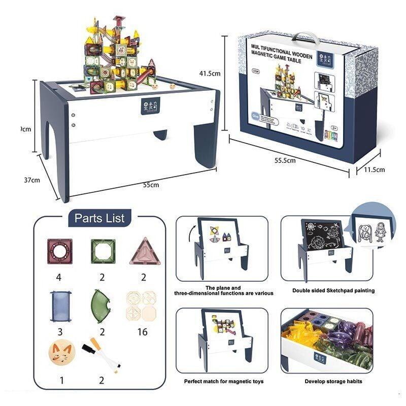 Невероятный игровой набор для детей от 3 лет, предназначенный для развития творческих и креативных способностей! Набор включает в себя магнитный конструктор (с туннелями и шариком), деревянный стол и двустороннюю доску для игр и рисования. В комплект входят 2 маркера "Пиши-стирай", которые предоставят ребенку свободу самовыражения. Главным преимуществом магнитного столика есть возможность складывать конструкции как в 3D, так и в 2D формате (прикрепляя детали конструктора на магнитную доску вертикально). Игровой столик станет любимым местом отдыха ребенка и откроет множество возможностей для его творческого развития! Особенности: - 3в1: магнитный конструктор, игровой стол и рисунок; - конструктор включает 30 элементов (включая туннели и шарик); - стол с крышкой, превращающейся в двустороннюю доску для рисования; - магнитная доска позволяет создавать конструкции в формате 2D; - в комплект входят 2 маркера "Пиши-стирай"; - размер столика в собранном виде – 55х37х23 см; - стол выполнен из древесины; – конструктор выполнен из пластика. * Характеристики и комплектация товара могут изменяться производителем без уведомления