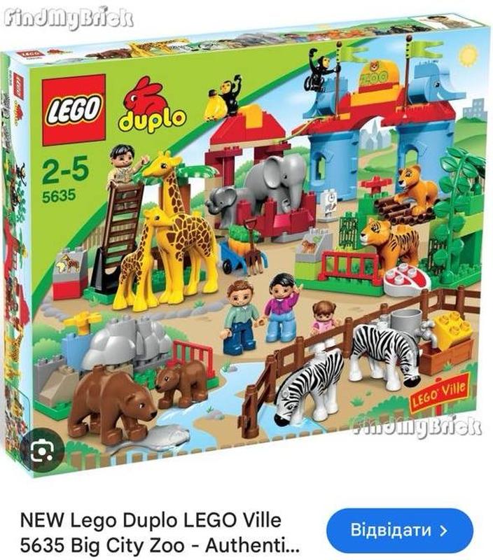 Lego Duplo зоопарк. Не вистачає декілька деталей, коробки та інструкції не має. Потребує промити водою від пилу. Додатково віддається блоки та іграшки з окремого фото. Продається набір Лего оригінал 5635 Великий Зоопарк.Сім´я слонів, мавпочки, жирафи, ведмеді, зебри, тигри. У кожного звіриного сімейства є просторий вольєр або пасовище, огороджений парканом. У зоопарку відвідувачі - сім´я , є працівник, який доглядає за тваринами, чистить у вольєрах і закладає корм в годівниці і воду в поїлки. Для мавп - в´язка бананів, тиграм - великі шматки м´яса, ведмеді дуже люблять рибу, зебрам припаде до смаку овес, а сімейства слонів і жирафів харчуються свіжою зеленню - до їх послуг пальми та інші рослини. Вхід до зоопарку виконаний у вигляді красивої арки, з боків якої розташовані фігурки веселих слоненят. Комплектація набору згідно фото.Стан гарний, потрібно помити від пилу.