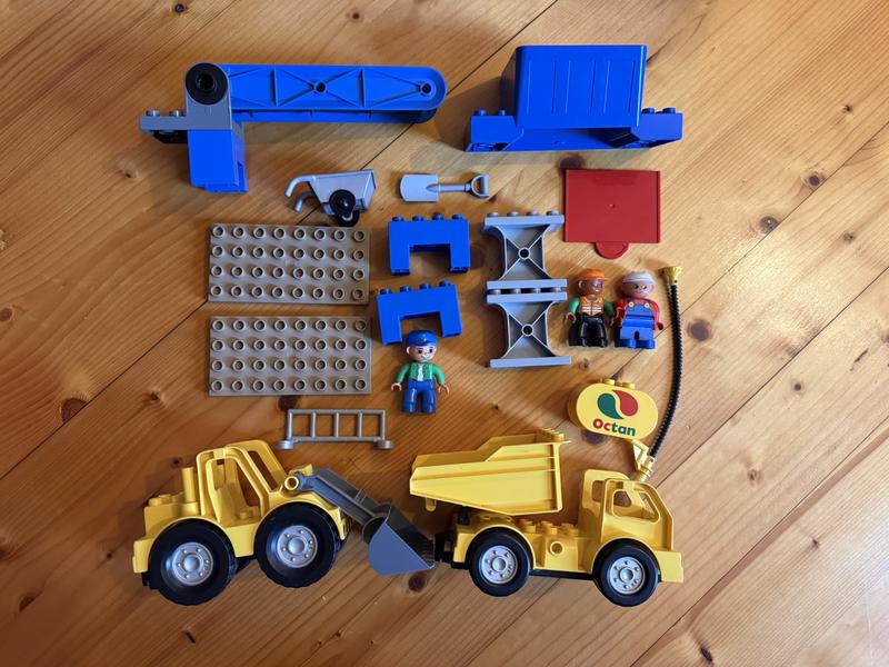Лот lego duplo строительная техника. Сердце набора - подвижная конвейерная лента: благодаря резиновой ленте с ребрами, «камение» (кубики) поднимается вверх. Сбоку расположена удобная ручка, которую легко крутить. При вращании лента приходит в движение, доставляя груз прямо до бункера. В нижней части бункера имеется открывающийся специальный люк. Вы можете подогнать грузовик под низ, открыть защелку, и гравий посыпется прямо в кузов.