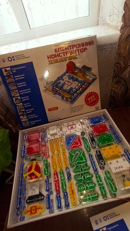 Конструктор в НОВОМУ стані ,подарований був на 10 років .Зацікавив абсолютно кожною схемою ,телефон не брали в руки тиждень майже.Всі деталі на місці.За допомогою конструктора можна зібрати: Радіо FM - регулювання гучності, автоматичне налаштування на станції. Вимірювальні схеми (вольтметр, амперметр) - 75 варіантів схем. Диктофон (запис / відтворення).Детектор брехні. Світловий індикатор - букви (великі та малі) і цифри. Автоматичні освітлювачі - "нагадування" про настання темряви, датчик дощу, нічник. Музичний дверний дзвінок з варіантами управління. Імітатори звуків - 12 варіантів, 120 варіантів схем. Охоронні сигналізації - відлякуючі звуки, звукова/світлова реакція на обрив проводу. Регульований метроном.