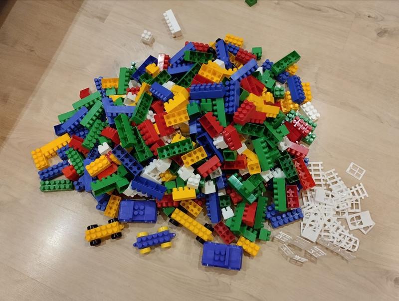 Великий конструктор для будівництва міста та гаражів, дуже зручний для самих маленьких, підійде для пісочниці. У наборі також є віконечка та дверцята, секції забору. Та вагончики на колесах 6шт + 2шт як машинки. Стан вживаний, але гарний, нема поломаних деталей. До великого додаю бонус у вигляді маленького (на останньому фото). Загально 402шт: - великі - 139шт - середні - 132шт - маленькі - 131шт - вікна - 14шт - двері - 6шт - дах - 7шт - секції забору - 8шт