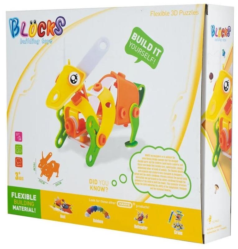 Зберіть цілий зоопарк тваринок від HANYE! У нас є Бичок, Жаба, Слоник, і ось до них приєднався Зайчик. А може у вас вийде зібрати інша тварина з наявних деталей? Пластиковий конструктор складається з 63 деталей: гнучких, жорстких, нерухомих і рухомих. Ви можете зробити тварина, яке зображено в інструкції, а може придумати щось своє. В іграшці відсутні гострі кути, а тому вона підійде для самих маленьких. Конструктор розвиває просторове і творче мислення, дрібну моторику, вчить елементарної механіки і моделювання. Конструктор Зайчика від HANYE – подаруйте дітям іграшку, яка не просто розважає, а йде на користь дитині! Розмір упаковки: 30,5х27,5х6,5 см Кількість деталей: 63 шт.