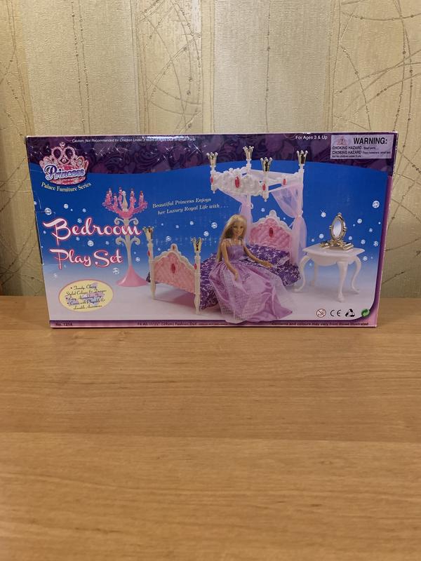 Меблі для барбі. Спальня для принцеси. Дуже сподобається вашій дівчинці цей набір лялькової меблів. У нього входить вишукана біло - рожева ліжечко з канделябром і яскравим, мереживним комплектом ліжечка; білосніжний столик , а на ньому дзеркало в золотій вишуканій оправі; елегантний свічник. Меблі підходить для ляльки 29 див. Розмір упаковки: 31*17.5*6 див. Набір новий.