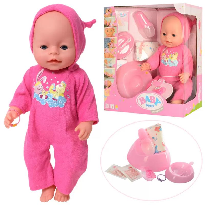 Очаровательный пупс Baby - аналог всемирно известного бренда - лучший подарок для девочки! Данный набор станет отличным поводом не скучать и подойдет для детей от года. Милый пупс обладает множеством функций, которые делают его схожим с настоящим младенцем. Среди таких функций выделяют следующие: 1. Возможность купания. Сама кукла выполнена из твёрдых материалов, которые позволяют её купать в настоящей воде. 2. Кроме этого, пупс BL 023 E умеет пить из бутылочки. 3. Кормить пупса-младенца можно из тарелочки специально приготовленной смесью, которая есть в наборе. 4. В комплект также входит подгузник в которой малыш сможет мочиться, если предварительно напоить его из бутылочки. 5. Для функции хождения на горшок пупса необходимо раздеть и, посадив на него, нажать на пупок. 6. Ручки и ножки пупсика подвижны. 7. Если нажать на ручку младенца, из его глаз польются слезы. Плачь не сопровождается звуковыми эффектами. 8. Кроме этого, глаза куклы закрывается, если ее положить на спину. Для выполнения всех функций, пупс дополнительно комплектуется набором необходимых аксессуаров, которые помогут девочке ухаживать за ним: • горшочек, • тарелка с ложкой, • бутылочка для кормления, • пакетик с кашкой, • подгузник, • пустышка, • браслетики, • ID-карточка. Восемь функций пупса BL 023 E и набор аксессуаров позволяют разыгрывать самые разные сюжетно-ролевые игры, при этом учиться заботе и ответственности и просто проводить время весело и непринуждённо! Рост малыша 43 см. Размер упаковки: 32 см × 18 см × 38 см