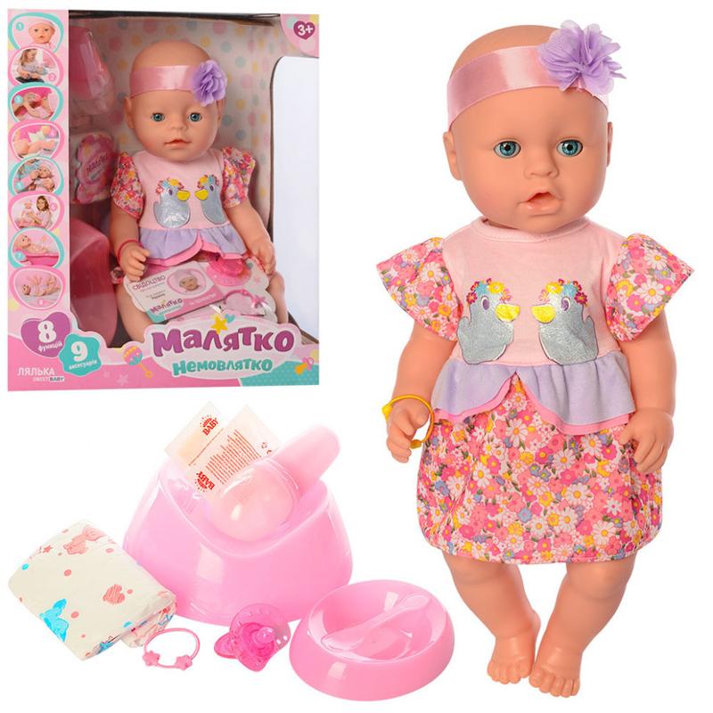 Пупс вміє робити практично все, що робить новонароджена дитина. Лялька вміє плакати, їсть спеціальну кашу, п'є з пляшки, після чого сходить на горщик. Разом з пупсом в коробці є памперс, горщик і все приладдя для годування – миска, ложка, пляшка і пустушка. Всього в інтерактивній ляльки 8 функцій до неї йде 9 аксесуарів. Одягнена дівчинка в миле сукню, на голові пов'язка, весь одяг знімається і її можна купати. Руки, ноги і голова рухаються. Іграшка виготовлена з якісного матеріалу, безпечного для дітей. Особливості ляльки: Вміє спати – очі закриваються; Реалістично виглядає; Ляльку можна мити; Плаче; Вміє їсти і пити; Ходить на горщик; Голова, руки і ноги рухаються. В комплекті: одягнений пупс, пляшки для годування, горщик, тарілка для каші, ложка, суміш-каша, соска, підгузник, ID-свідоцтво, браслетик на ручку.