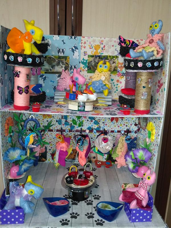 Дом-магазин для собачек и кошек. Размер 41 см х 32 см, высота 45 см. Ручная работа. На первом этаже расположен модный магазин с одеждой, на втором этаже комната с кроватями. Продается со всем, что на фото. Состоит из домика, 3 собачки, 3 кошки, мебель, одежда, постельные принадлежности, сумки, посуда (всего 98 предметов). Відправляю укрпоштою та новою поштою.