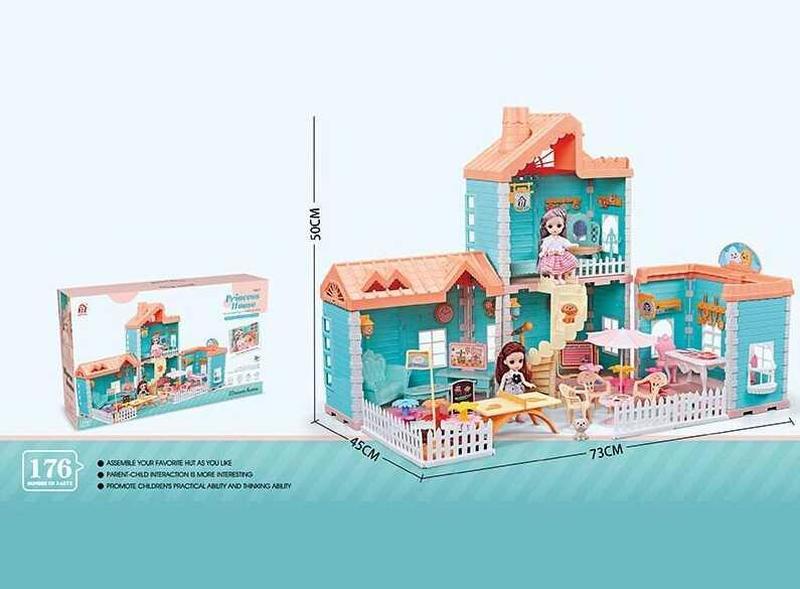 Деталізований ляльковий будиночок, який нараховує 2 поверхи. У складеному вигляді будинок включає 3 кімнати та подвір’я, на якому можна пограти в настільний теніс та весело провести час. Кожна кімната облаштована відповідними меблями та різними аксесуарами. До комплекту також входять 2 ігрові фігурки - 2 маленькі ляльки та 2 собачки. Особливості: - ляльковий будиночок з меблями; - набір включає 176 деталей; - будиночок має легко збірну конструкцію; - готова конструкція включає: спальню вітальню кухню подвір’я - до комплекту входять 4 ігрові фігурки ; - присутні тематичні наліпки; - розміри будиночка у складеному вигляді - 73х45х50 см; - виконаний з міцного первинного пластику. Розміри / габарити - Довжина : 73 см - Ширина : 45 см - Висота : 50 см Розмір упаковки: 60 см × 13 см × 45 см * Характеристики та комплектація товару можуть змінюватися виробником без повідомлення