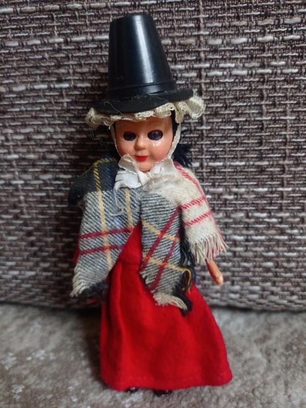 Кукла вінтажна сувенірна в національному валлійском костюме Британка из Уэльса 17 см. Спящі глазки, ручки подвіжні. Шляпа- циліндр повреждена (див. останнє фото). Кукла ГДР, 70-х годов.