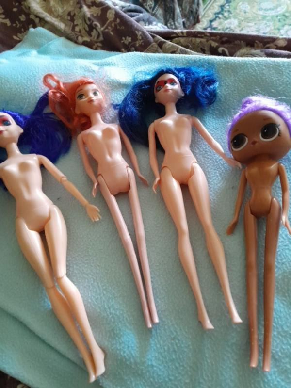 наявні 4 ляльки,але ньюанс в тому, що вони не мають одежі,в однієї ручки та ніжки згинаються в усіх суглобах,голівки мягкі,Положення:сидяче та лежачи.Можна лотом купити--ціна 160грн за всі якщо поштучно--то 45грн/шт.