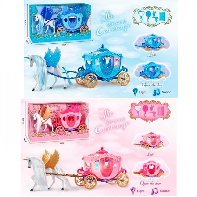Карета з конем 2223B-D Карета з конем 2223B-D. Ваша дитина завжди буде радий такому подарунку. Граючи дівчинка зможе вигадувати безліч сюжетів для гри. Характеристики: - Тип: карета з конем - Матеріал: пластик - Кількість дизайнів: 2 - Розмір упаковки: 38х21,5х14 см - Упаковка: картонна коробка - Колір: різні кольори Комплектація: - Карета - Кінь - Аксесуари