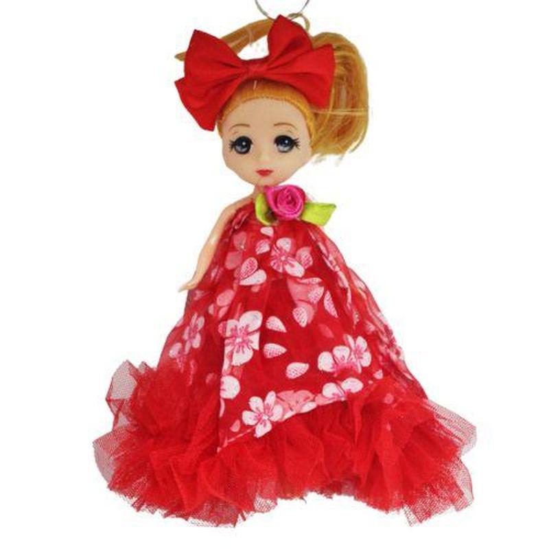 Красива лялечка, яку можна прикріпити до сумки, одягу або ключів за допомогою металевого кільця. Одягнена в пишне фатинове плаття, прикрашене квіточками та оборками. Волосся зав'язане у хвіст за допомогою гумки. Розмір лялечки: 7х4х6 см. Виготовлена з якісних і міцних матеріалів.