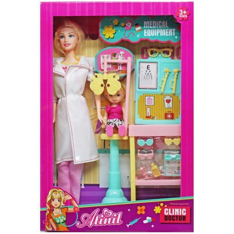 Яскравий ляльковий набір, до якого входять дві лялечки (лікар і маленький пацієнт) і різноманітне обладнання лікаря-офтальмолога. У комплекті є стіл і стільчик для огляду, окуляри, молоточки, шприц, планшет для записів та інші дрібні аксесуари. Висота ляльки-врача — 28 см. Руки та ноги рухливі.