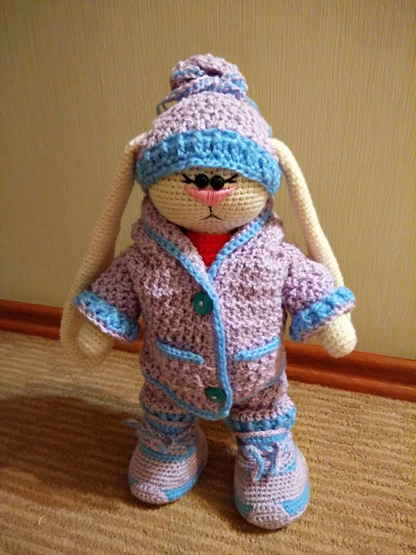 Тип іграшки: Ляльки Іграшка ручної роботи, зв'язана з поліалергенних матеріалів На гуздиковому кріпленні, за рахунок чого зайчик може рухати ручками і ніжками Він стоїть ,сидить самостійно Оченята на безпечному кріпленні Весь одяг знімається Зайчик одягнутий: кофточка, комбінезон, кросівки ,светрик з капюшоном,шапка) Висота іграшки 40см Буде гарним подарунком на свята як дорослому так і дитині) Все гарно упаковую+невеличкий подаруночок