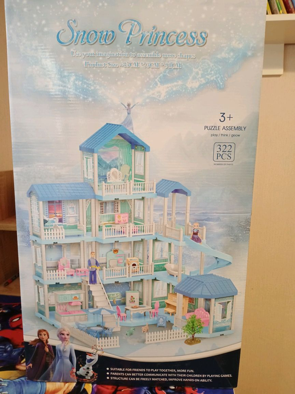 Виробник: Інший виробник Тип іграшки: Ляльки Величезний дитячий будиночок розмір 85*73*91см 322деталі з фігурками з мультфільму фрозен.дуже гарний на подарунок