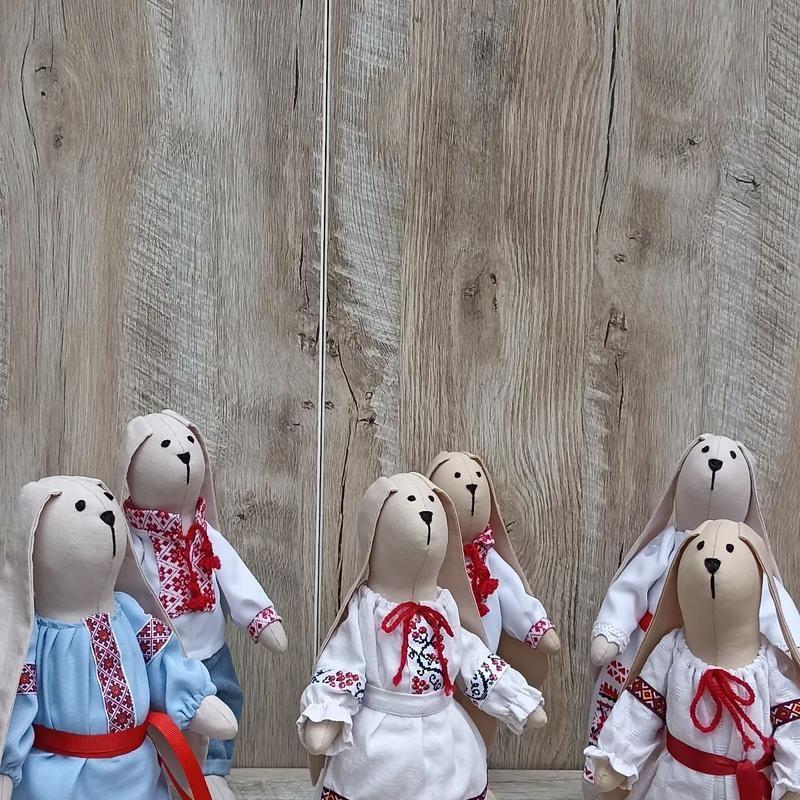 Еко-зайчики виготовляю в різних вбраннях .Мої зайчики підійдуть як для гри дитині тому що вони безпечні їх можна прати в пральній машині.Зацчик самостійно стоїть ручки ніжки рухомі.Також можна подавати рідним як цікавий етно подарунок. Товар виготовляється на замовлення