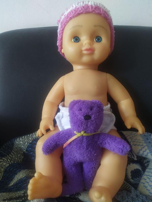 Без волосся. Продається в шапці і імітованому памперсі з ведмедиком як на фото. Вся резинова. Є пищалка, але вона не працює.