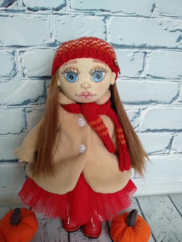 Лялечка ручної роботи з якісного велюру. Зріст 25 див. Руки, ноги, голова рухаються. Особа розписано сухий пастеллю і акриловими фарбами, закріплено фіксують лаком. Волосся - штучні тресс, приклеєні і пришиті. У комплект одягу входять: трусики, колготки,світшот, спідничка, пальтечко, шалик, шапочка і черевики з натуральної шкіри.