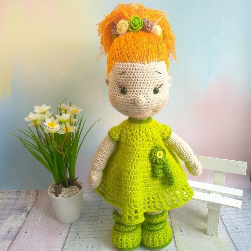 Весна пришла! Куколка Весна вывязана из хлопковой пряжи.Каркасная игрушка.Рост 34см.Подвижны ручки.Волосы можно расчёсывать.Комплект одежды :платье,трусики,туфельки,веночек.С ней приятно играть,переодевать,что очень любят девочки.Красиво упакую в подарочную коробку. Отличный подарок,сделанный с любовью. Товар виготовляється на замовлення