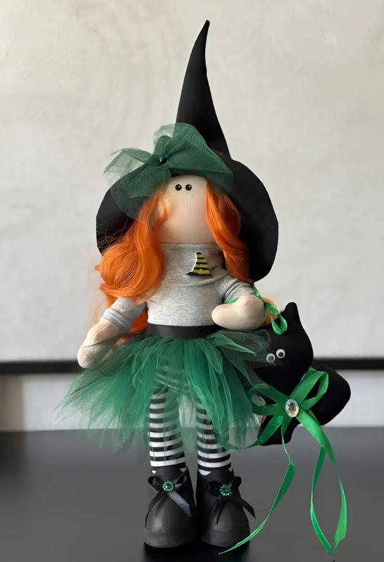 Особливості: інтер’єрна лялька – велика авторська інтер’єрна лялька – Хелловін лялька відьма 37 см у святковому halloween образі рудої ляльки відьми на Хелловін. У ляльці текстильній – відьма авторська лялька шапочка ковпак, одяг та туфельки не знімаються! Текстильна інтер’єрна лялька – оберіг відьма ляльки стоїть самостійно, без опори! У ляльці відьмі Хелловін всі частини тіла – ніжки і ручки – гнучкі!