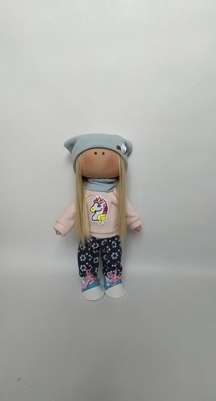 Текстильна лялечка ручної роботи зростом 30см. Самостійно стоїть,може сидіти. Ручки, ніжки і голова рухливі. Одяг не знімається,зняти можна тільки взуття. Можливе виготовлення під замовлення в інших кольорах.