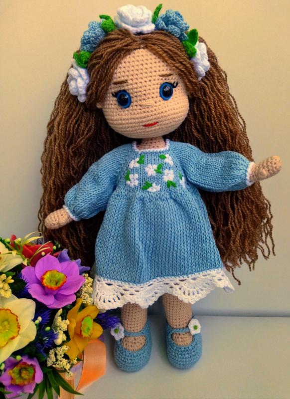 Каркасна лялечка висотою 35 см. Ниточки 50% хлопок 50% акрил. Наповнювач гіпоалергений холлофайбер. Лялечка має каркас,тому ручки, ніжки ,голова згинаються. Очі на безпечному кріпленні.Волосся густе.Можна змінювати зачіски. Весь одяг та взуття знімається. На сукні ручна вишивка. В комплект одягу входить: трусики,сукня,туфельки,пальто, беретик,шарф,віночок. Товар виготовляється на замовлення