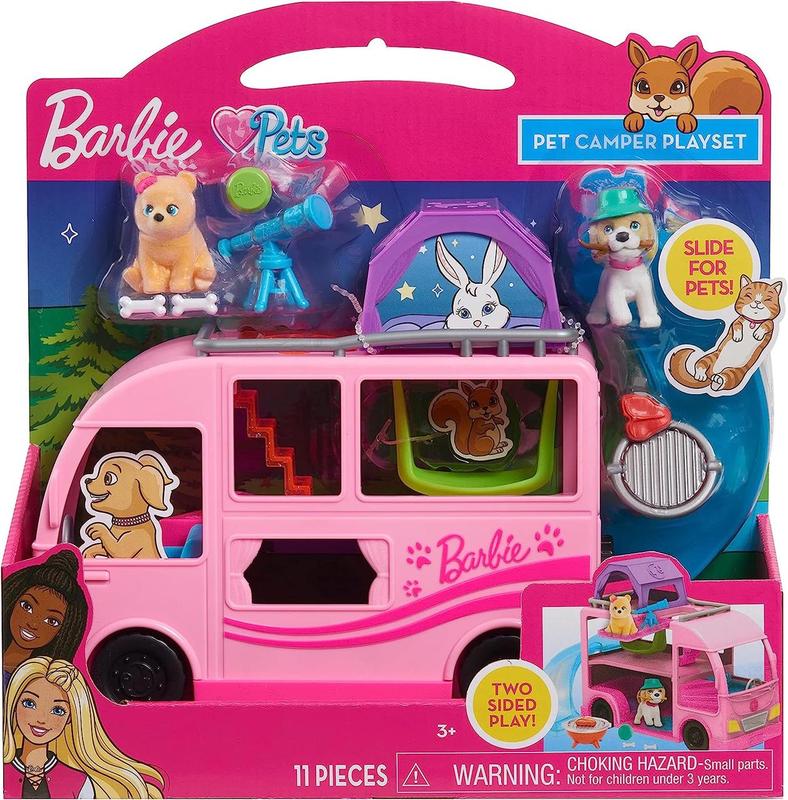 В наявності. Офіційне промо - Оглядове - Новий. Оригінал. За запитом на вайбер підвантажимо весь асортимент по темі. - Whether you're shopping for a kids toy as a gift, birthday present, or just because, the Barbie Pet Camper Playset makes a wonderful surprise! - Includes: 1 camper, pair of 1.5-inch pet figures, 1 tent, 1 play grill, 1 play steak, 2 bones, 1 frisbee, 1 slide. - Pets Travel in Style: The Barbie Pet Camper Playset is loaded with creature comforts and lots of fun activities to explore. - Brimming with Play Potential: This kids' toy camper features 2-sided play on 3 unique levels. - Lots To Do On Three Floors: The first floor features a luxe pet bed; the second, a swinging hammock and attachable slide; the third, a roof deck with room to pitch a tent and sleep under the stars. - Camp Out on the Third Floor Roof Deck: Host a stargazing party on this imaginative roof deck with the play telescope. - Working Wheels: The camper's wheels really roll. - Barbie Pets Perfect for Little Animal Lovers: Collect other Barbie Pets toy figures and playsets, to multiply the fun of pet ownership. - Barbie Pets Make Wonderful Kids Gifts: The Barbie Pets Camper Playset preschool toy is a perfect gift for kids and animal lovers ages 3 years and up. Product Description Travel in style with the Barbie Pet Camper Playset. This pink RV with working wheels has the latest in creature comforts for 2 mystery 1.5 inch Barbie Pets. Find lots of fun accessories including a removable tent, telescope, grill with play steak, 2 bones, and a frisbee. Kids will enjoy three floors of camping fun. The main cabin features a luxe pet bed. Upstairs, find a swinging hammock and an attachable slide. Open the transforming roof hatch, pitch a tent, and imagine exploring the night sky with the telescope. When it's time to hit the road, pack up, and store all pet accessories inside. Afterwards, drive the camper to the next exciting destination! This delightful camper coordinates with other Barbie Pets preschool toy figures and playsets. It makes a wonderful holiday or birthday gift for kids ages 3 years and up. Important information Safety Information May contain small pieces. From the manufacturer Barbie Pet Camper Playset Travel in style with the Barbie Pet Camper Playset. This pink RV with working wheels has the latest in creature comforts for 2 mystery 1.5 inch Barbie Pets. Find lots of fun accessories including a removable tent, telescope, grill with play steak, 2 bones, and a frisbee. Kids will enjoy three floors of camping fun. The main cabin features a luxe pet bed. Upstairs, find a swinging hammock and an attachable slide. Open the transforming roof hatch, pitch a tent, and imagine exploring the night sky with the telescope. When it's time to hit the road, pack up, and store all pet accessories inside. Afterwards, drive the camper to the next exciting destination! This delightful camper coordinates with other Barbie Pets preschool toy figures and playsets. It makes a wonderful holiday or birthday gift for kids ages 3 years and up.