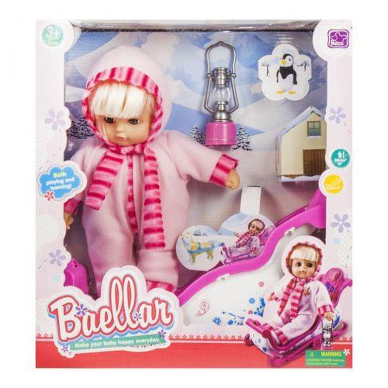 Мила лялька пупс одягнена в зимовий рожевий комбінезончик. У наборі з пупсом так само є санки і лампа. Розмір пупса 33 см. Розмір санок 32х19 см. Для дітей від 3-х років. Бренд: Baellar Упаковка: Коробка Колір: Різнобарвний Вага з упаковкою: 1138 г Габарити в упаковці: 36 x 39 см Країна виробник: Китай Матеріал: Комбінований