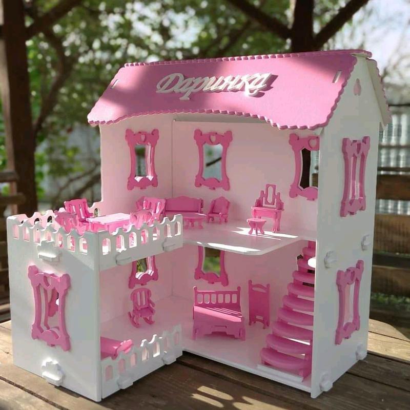 будинок для ляльок розбірний з меблями розмір 51*46*42 см. виготовлений з вологостійкої фанери товщиною 6мм , покритий акриловою фарбою сертифікованою для дитячих кімнат Власне виробництво. Палітра кольорів в наявності