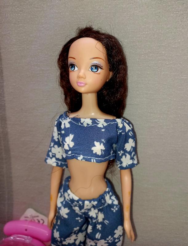 Высота куклы 30 см. Есть пустышки волос но не видны. Комплектация как на фото. Чемодан с выдвижной ручкой. В средние кукольные вешалки.