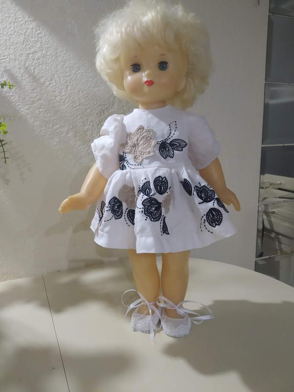 Невизначена лялечка радянських часів. За райдужкою очей схожа на ранній кругозор. Підфарбовані губи. Вбрання й взуття пошиті для дівчинки. Має одну особливість: домішки чогось темного в пластик на нижній частині животика. Жодних дефектів, тріщин, пропусків волосся немає. До власника приїде як на фото .