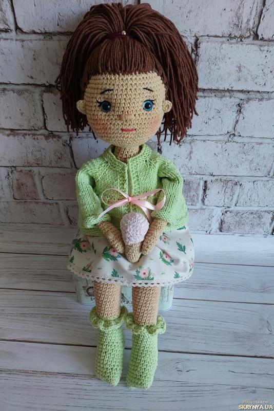 Вязаная кукла в кардигане. 40 см, ніжки згибаються,одяг зеімається, , можна робити зачиски, любить морозиво.