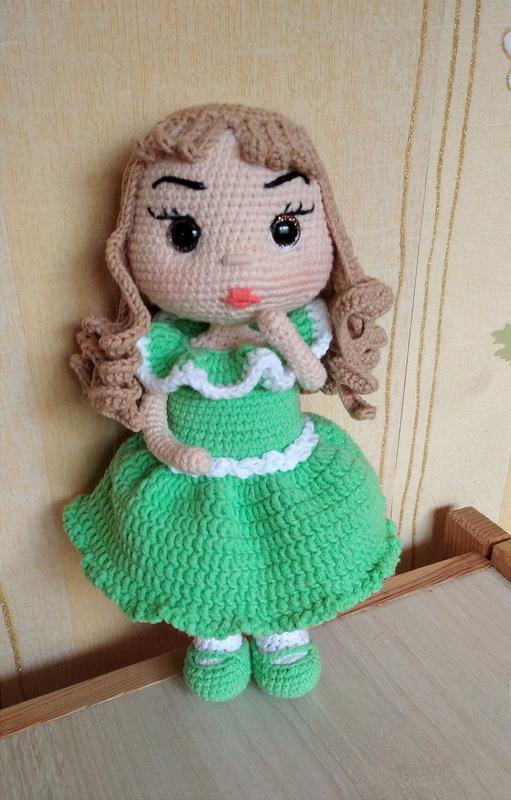 Лялька з напівбавовняної пряжі зв'язана гачком. Зріст іграшки 25 см. Є дротовий каркас у ручках та шиї. Знімаються тільки туфлі, інша одежа не знімається. Оченята на безпечному кріпленні Наповнювач холофайбер