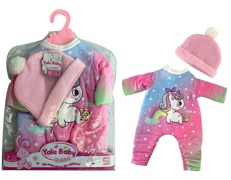 Теплий костюм для ляльки. У наборі: теплий комбінезончик із принтом єдинорога, рожева в'язана шапочка, вішак для одягу.