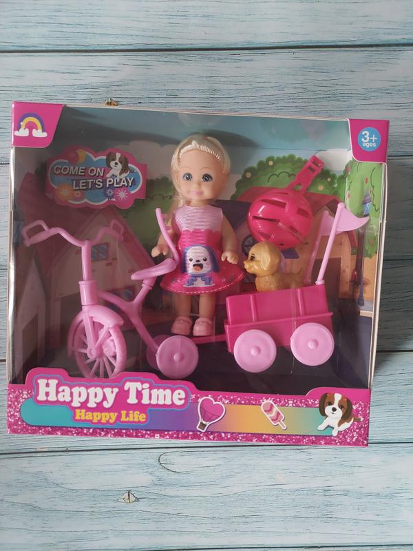 Лялька з велосипедом, шоломом на голову, причіпчиком з маленькою собачкою. Висота лялька 12 см, коробка 19,5х17х5,5см.