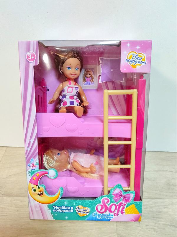 Красуня Софія збирається до своєї кращої подруги! Приємне очікування гарного відпочинку з коханою подругою змушує забути про всі повсякденні турботи. Розкидані подушки та м'які пледи створюють атмосферу затишку та комфорту. Тут, серед ароматних свічок, розповідаються секрети, зароджуються нові ідеї, розквітають мрії та лунає дзвінкий сміх! Особливості : - ігровий набір у тематиці "Ночівка у подружки"; - включає 2 ляльки та двоповерхове ліжко з приставними сходами; - ляльки мають довге шовковисте волосся та виразні риси обличчя; - іграшки одягнені в знімний одяг; - висота ляльок становить 11 см; - тіло ляльок виконане із пластику, а голова - із гуми.