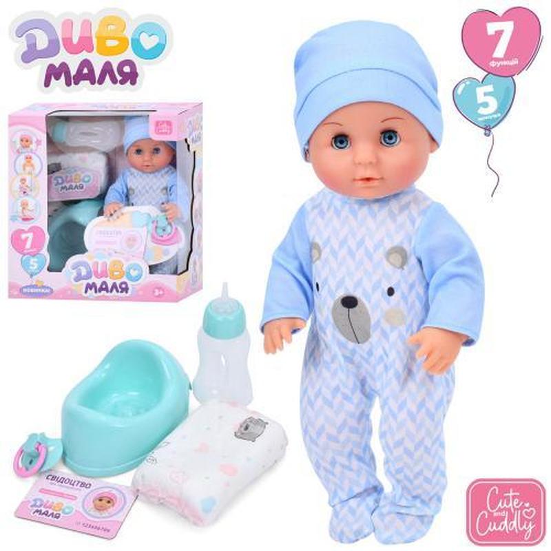Пупс "Диво маля", 30 см. П'є та пісяє. 7 функцій, 5 аксесуарів в комплекті. Живлення - батарейки. Паковання — коробка. Розмір - 26,5х14,5х29,5 см.