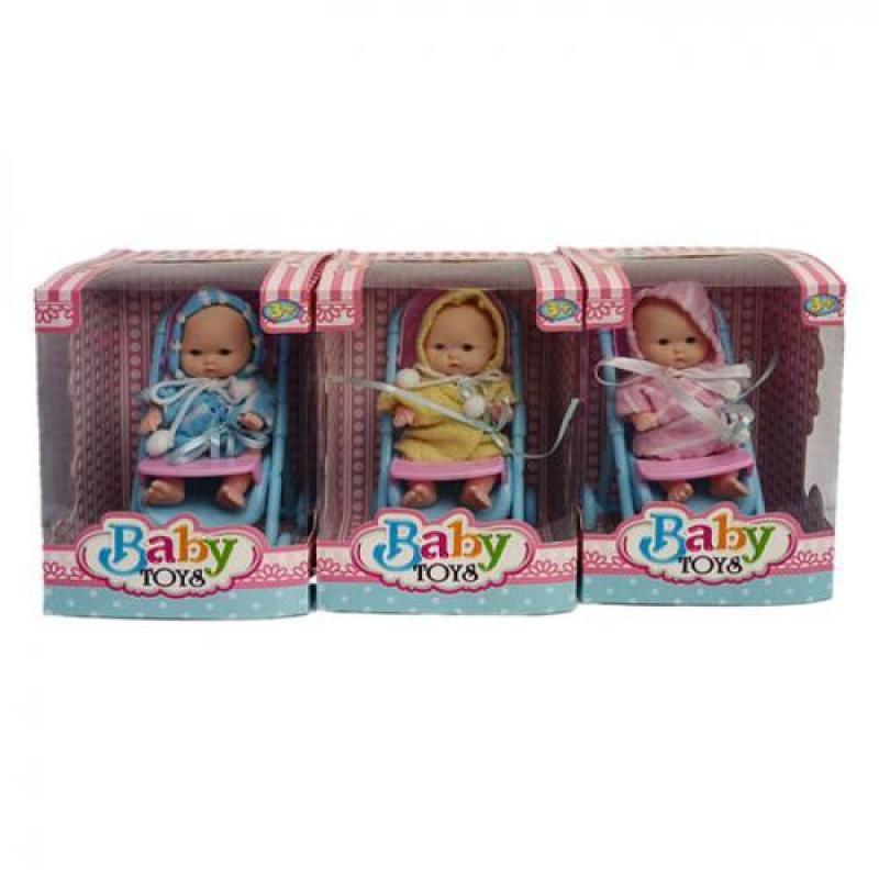 Пупс "Baby Toys", 12 см, 3 види. Коляска 14 см. Матеріал - комбінований. Паковання — коробка. Розмір - 11,5х10х15,5 см.