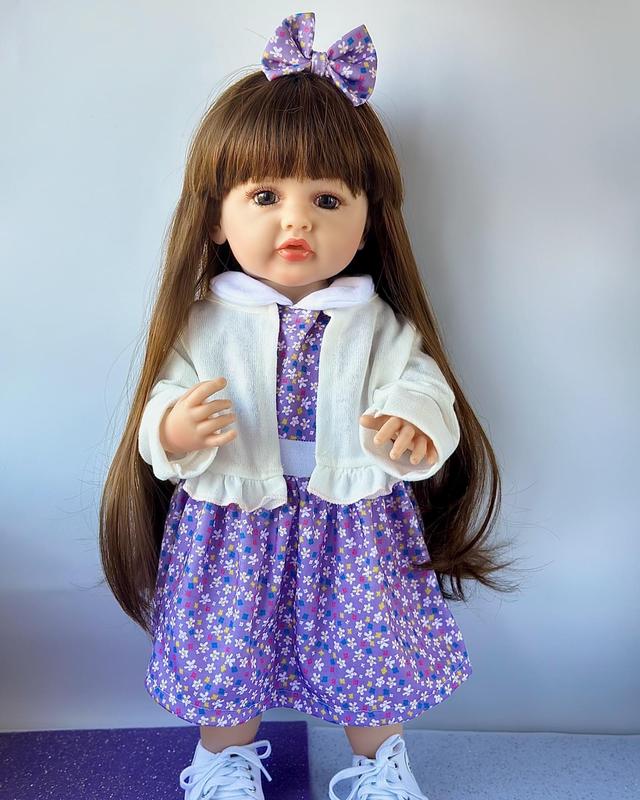 Привет! Я хочу быть твоей подружкой. Выполнена я из высококачественного винил-силикона. Меня можно купать. Я могу сидеть, стоять и лежать. Мне можно делать прически, волосы длинные, приятные на ощупь, как у человека. Мочить волосы мне не рекомендовано, поэтому при купании надевайте мне защитную шапочку. Мой рост 55 см. Я одета в фиолетовое цветочное платье и белую кофточку. Также, свои ножки обуты в белые кроссовки. На голове у меня заколка-бантик в тон платья. Имею с собой магнитную пустышку, бутылочку, памперс 💜✨ Я жду тебя.☺️